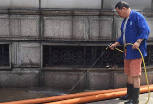 | 梅雨季節(jié),青苔是最容易滋生的植物。投資廣場(chǎng)污水排水管道因市政軌道施工而被堵住,只能依靠排水泵自主排水到路面 |
