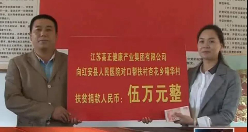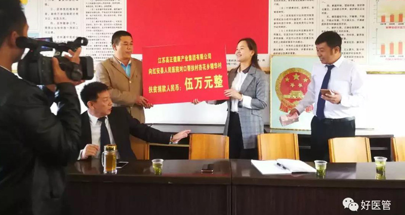 2018年10月18日,江蘇高正健康產(chǎn)業(yè)集團(tuán)副總裁葛海霞、總經(jīng)理范錦飛一行,來(lái)到紅安縣人民醫(yī)院對(duì)口扶貧單位杏花鄉(xiāng)精華村,將5萬(wàn)元善款交給村干部,表達(dá)了高正健康產(chǎn)業(yè)集團(tuán)“好醫(yī)管”關(guān)注老區(qū)、甘愿扶貧的真情實(shí)意。