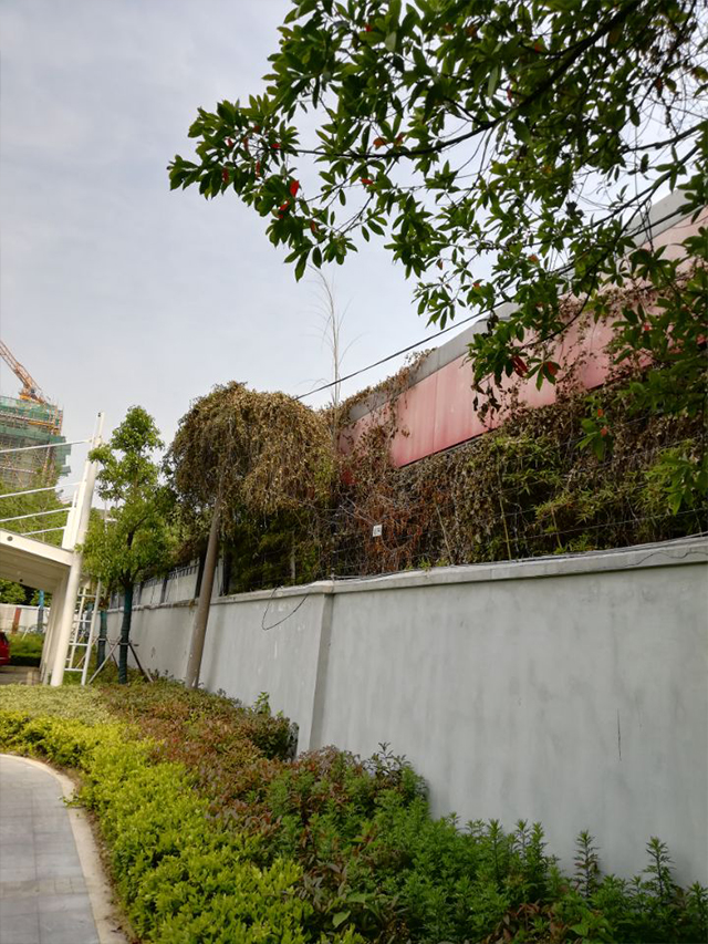 特檢院隔壁汽車4S店圍墻內長了一株野生爬山虎,適應性強生命力旺盛的爬山虎生長速度快,順著圍墻肆意攀爬,已經嚴重影響到特檢院電子圍欄的正常使用。爬山虎的枝條把電子圍欄線給纏繞起來,值班室警鈴大作,經常要拿梯子爬到圍墻上對繞在電子圍欄線上的爬山虎枝條進行修剪,多雨季節(jié)更是生長迅速,給修剪帶來了一定的麻煩。