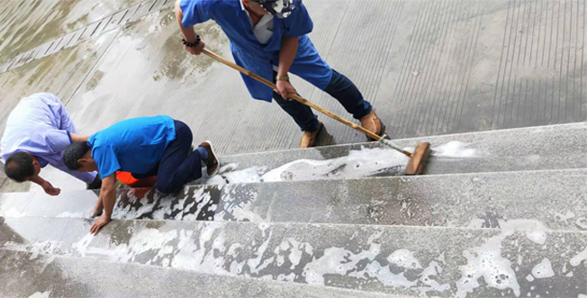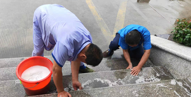 “好醫(yī)管”醫(yī)療事業(yè)部啟東市人民醫(yī)院項目部,2019年7月13日,外面雨淅淅瀝瀝的下著,看著西門口那黑不溜秋的臺階,不清洗又不行,怎么辦?一個工友說"干",說干就干,于是大廳的阿姨拿來了"正在工作"的禁示牌,放在平臺上,王師傅拿來了地刮刀、長刷子等清潔工具,同時還提了兩大桶開水,開始工作了。他們先在水里倒點洗衣粉,攪勻,然后把水倒點臺階上,三個人一個用清潔球刷,一個用長刷子刷,還有一個用地刮刀刮臟水,分工倒很協(xié)調。大廳的阿姨則負責讓過往的行人從側面行走。再看他們,刷了一梯又一梯,終于把那么大的一個臺階給刷完了。接著張師傅拿著桶去提干凈的水,他要把刷好的臺階上的臟水給沖掉,提了一桶又一桶,沖了一次又一次,同時沈師傅把剛才沒刷到的又清理了一下,王師傅把沖下來的臟水用地刮刀全部趕到下水道里。一切配合的那么默契。外面的雨還在淅淅瀝瀝地下著,而我們的三個師傅不怕辛苦,冒雨把臟兮兮的臺階刷得那么的干凈,真的要給他們點一百個贊!