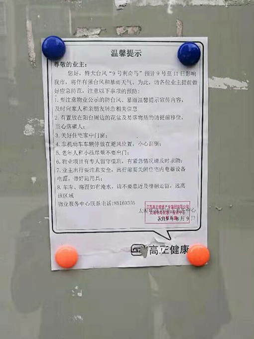 8月份的溫度還是居高不下,據(jù)氣象臺發(fā)布的消息,特大臺風(fēng)9號利奇馬預(yù)計9號到11號影響我市,將伴有強臺風(fēng)和暴雨天氣。我們太湖明珠苑物業(yè)積極響應(yīng)相關(guān)部門的要求,開始啟動防洪應(yīng)急預(yù)案,為了避免小區(qū)可能發(fā)生的安全隱患。
