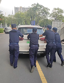 1號崗可是奧體中心車輛進出的關鍵通道,電車停在這里,不僅會引發(fā)交通擁堵,還可能潛藏著安全隱患。徐偉文立即將這一情況上報給了主管。項目經(jīng)理周經(jīng)理得知消息后,第一時間火速趕到現(xiàn)場。當機立斷做出安排,迅速調(diào)來4名保安前來支援。這4名保安接到指令后,迅速集合到位。他們分工明確、配合默契,迅速投入到救援行動中。有的保安在電車后面,雙手穩(wěn)穩(wěn)地抵住車身,齊心協(xié)力地推動;有的則在一旁適時指揮,確保推車過程安全有序。而車主則坐在車里,全神貫注地掌握著方向。
