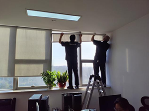 此時正值正午,室外陽光強烈,410 辦公室因沒有窗簾遮擋,辦公區(qū)域被曬得發(fā)燙。賀師傅深知大家的需求,更換好拉繩后沒有片刻耽擱,立刻聯(lián)系保安馮師傅幫忙。兩人抬著維修好的窗簾趕回 410 辦公室,一人扶著窗簾,一人固定軌道,配合默契,以最快速度完成了窗簾的重新安裝。