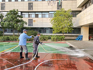 此次需要清洗的籃球場長期暴露在戶外,狀況不容樂觀。塑膠地面部分開裂起皮,臟污淤積其中,地勢不平的地方由于常年少陽光照射,經雨水沖刷后臟污大量堆積,地面十分滑膩。為了盡快完成清洗工作,項目部緊急調集工作人員,大家分工明確,采用地刷和水管沖洗的方式,對場地進行全面細致的清洗。工作人員們不怕臟、不怕累,不放過任何一個角落。在完成清洗后,又及時將地面積水拖干凈,確保場地干燥、安全。