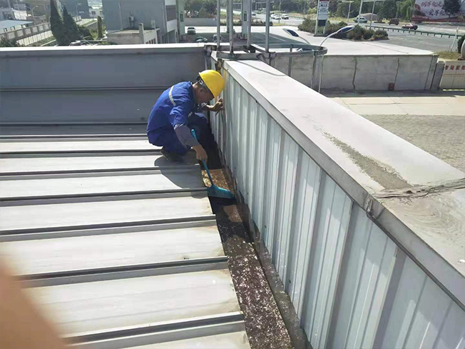 屋面天溝又叫檐溝,是屋面的排水溝。由帶坡度的屋面匯集雨水于天溝,經(jīng)過落水口流入雨水豎管排泄至地面散水或雨水溝。雖說天溝作用是排水,但實(shí)際使用中往往會因?yàn)橛炅窟^大或落葉雜物堆積,出現(xiàn)落水口封堵、排水不暢而引起滲水問題。所以,天溝的清理也是十分重要的。因此,我們安排了2名維保人員對場地內(nèi)的天溝進(jìn)行了逐一的清掃工作。因是登高作業(yè),我們也要求員工要做好安全防護(hù)工作,安全帽一定要佩戴,也提醒員工上檢修梯的時候,屋頂打掃的也一定要注意安全。每個屋頂?shù)奶鞙蠈挾榷疾灰粯樱械膶挼目梢杂脪咧阒苯舆M(jìn)行清掃,有的比較窄的只能用鏟子一點(diǎn)點(diǎn)的進(jìn)行鏟出,里面的泥土也要鏟出,防止堆積下雨時堵塞落水管。我們以切實(shí)的行動投身到環(huán)境衛(wèi)生清理行動中,為干凈衛(wèi)生的考訓(xùn)場面貌貢獻(xiàn)力量。