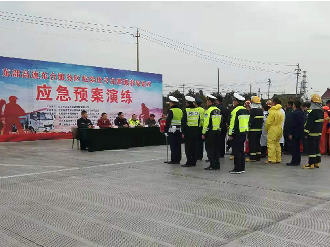 為積極貫徹江蘇省交通控股公司開展高速服務(wù)區(qū)“應(yīng)急預(yù)案演練月”活動(dòng)的相關(guān)要求,進(jìn)一步規(guī)范服務(wù)區(qū)應(yīng)急預(yù)案管理體系,提升服務(wù)區(qū)對(duì)突發(fā)事件應(yīng)急處置能力,11月26日,東臺(tái)服務(wù)區(qū)聯(lián)合鹽通管理處、派出所、交警、路政、消防隊(duì)、高速清障隊(duì)、東臺(tái)人民醫(yī)院及服務(wù)區(qū)各承租方等單位在東臺(tái)服務(wù)區(qū)共同舉辦了“危險(xiǎn)化學(xué)品泄露事故應(yīng)急預(yù)案演練活動(dòng)”。東部高速副總經(jīng)理吳海翔、各部門管理處相關(guān)負(fù)責(zé)人以及東部高速全線各服務(wù)區(qū)管理人員、各物業(yè)公司負(fù)責(zé)人、全線物業(yè)公司部分保安參加了觀摩。