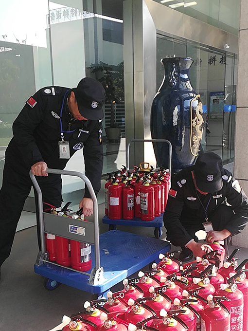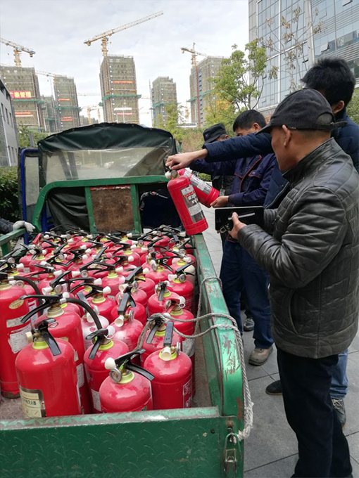 2019年12月,根據(jù)登記,特檢院滅火器到期需要更換充裝。物業(yè)主管提前報備甲方負(fù)責(zé)人,并聯(lián)系專業(yè)充裝人員來園區(qū)對滅火器檢查。由于院區(qū)滅火器購買時間已久,部分可能需要報廢。物業(yè)主管先請專業(yè)人士對滅火器進(jìn)行試壓檢查,對需要報廢的滅火器報備甲方報廢,需要充裝的進(jìn)行充裝。物業(yè)協(xié)助各樓層滅火器分批收集更換充裝,并對報廢的滅火器進(jìn)行統(tǒng)一處理。