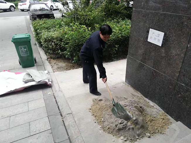 經(jīng)與樂聚物業(yè)負責(zé)人協(xié)商,對方允許敷設(shè)水泥,澆灌路面,但施工須由我方自行解決。在獲得業(yè)主移動方領(lǐng)導(dǎo)同意后,移動高正物業(yè)項目部立即響應(yīng),組織保安、保潔人員想辦法弄來石子、水泥、黃沙等基礎(chǔ)材料及施工工具,齊力施工。