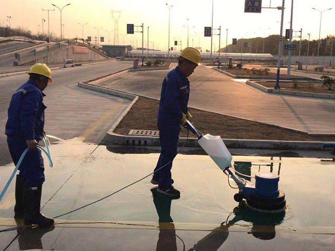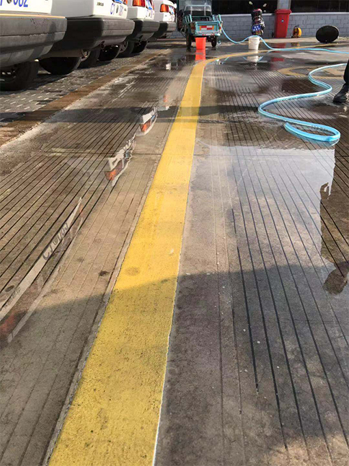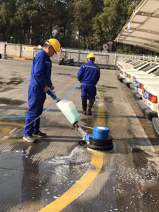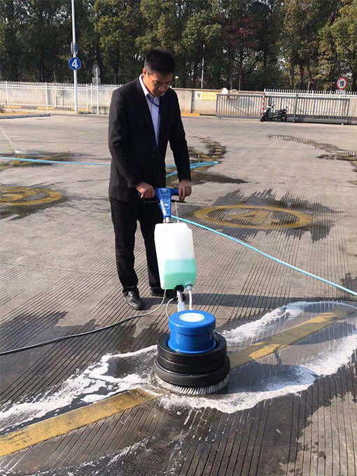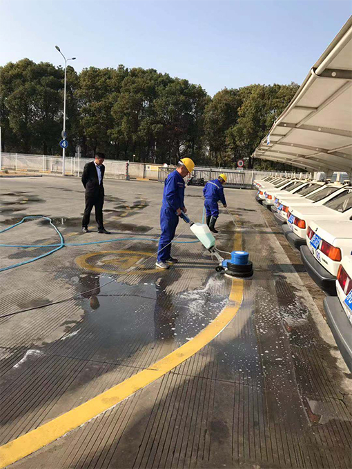 以前,清洗場地地標線都是人工進行清洗,不僅需要預(yù)備十幾個保潔員,且因保潔員在用地刷刷的時候用力有限的,清刷出來的地標線仍有灰蒙蒙的。為此,我們物業(yè)在星期五下午不考訓(xùn)時,將新配備的洗地機進行了初步試用。因保潔員都未曾使用過此機器,項目經(jīng)理便親自進行教授此機器用法及使用時需注意事項,考慮到需要掌控機器的力較大,保潔員都是女士,無法將其掌控,便安排了一個維保員來進行學(xué)習(xí)及后期的清洗工作。在學(xué)習(xí)會機器的使用方法后,便先對一段黃線地標線進行清洗,與未清洗的地標線進行對比,確實干凈很多,也亮了很多?吹叫Ч螅覀儽銓區(qū)整場地的地標線進行清洗。雖說使用機器洗方便,不過,因場地設(shè)計特殊性,還是安排了3-4名保潔員在機器清洗后,一個用水管清水進行沖洗,其他保潔員用大竹掃帚進行清掃,防止積水。最終,經(jīng)過一天的努力,終將E區(qū)場地黃色地標線全部清洗干凈。