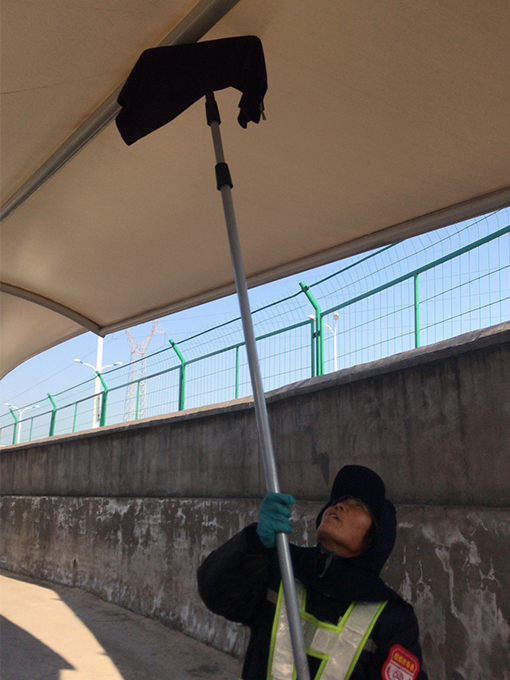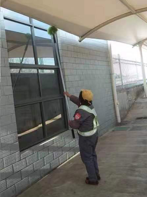 雨棚全長(zhǎng)靠八百米左右,且因風(fēng)吹雨打日曬的,看起來比較臟,起初在撣掃的時(shí)候,是想用長(zhǎng)柄的玻璃刷進(jìn)行擦拭,可以將上面的灰塵擦拭掉,可是在實(shí)踐中卻發(fā)現(xiàn)并不可行,收縮的伸縮桿較重,較粗的毛頭擦不到夾縫里,沾濕的毛巾擦在雨棚上,越擦越臟。因此,我們只能另改工具,用撣掃蜘蛛網(wǎng)的圓形撣子進(jìn)行撣掃。果然,效果較好。撣子上的不銹鋼管事空心的也比較輕,撣球在撣掃時(shí)夾縫里都能撣掃掉,雖然不能雨棚上的污漬撣干凈,但能把上面得的一層灰都能給撣掉。在撣掃過程中,會(huì)有人來人往的訓(xùn)練學(xué)員,我們會(huì)提醒他們,注意頭頂落灰,注意撣掃的桿子。以防桿子打到腳,導(dǎo)致摔倒。雨棚雖長(zhǎng),但我們一絲不茍的將之撣掃干凈,讓學(xué)員有更好的考訓(xùn)環(huán)境,讓駕校更加干凈美麗。