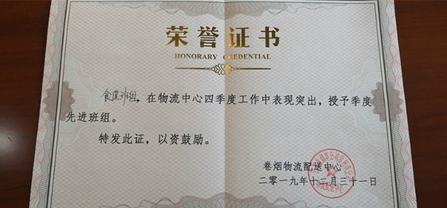 隨著2019年尾聲,迎來2020年的鐘聲,總結2019年的工作,高正集團煙草項目部各部門員工都得到了甲方領導的認可,最值得慶賀的是煙草物流食堂班組,因在物流中心四季度工作中表現突出,授予甲方領導頒發(fā)的季度先進班組榮譽證書稱號。