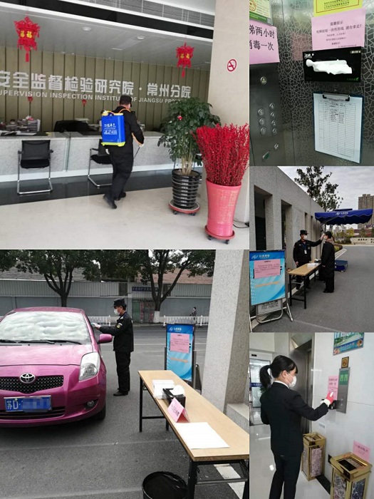 特檢院全體物業(yè)人員在甲方人員上班前已經(jīng)提前到崗,對園區(qū)進行打掃、消毒,大門口張貼溫馨提示。并在門崗設置了消毒臺桌和體溫槍,每一個進入園區(qū)的人員都要測量體溫,體溫正常方可登記入內(nèi)。當工作人員進入電梯,會有更大的發(fā)現(xiàn),每個電梯里面和外面都有一盒餐巾紙和溫馨提示,以及兩小時消毒一次臺賬, 能夠明確消毒時間,消除了業(yè)主和用戶的焦慮感。大樓主要入口我們專門鋪設了消毒毯,讓每一位進入大樓的員工都能在消毒毯上走過。