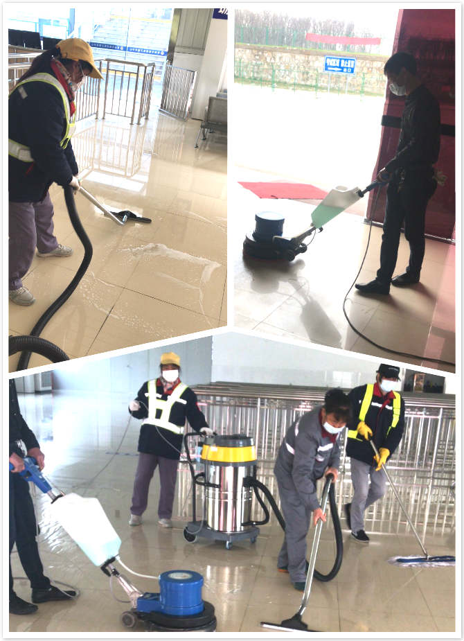 在清洗前,物業(yè)人員先將室內(nèi)的休息椅等物體搬離,并安排水電工做好電源及洗地機、吸塵器各部件的檢查工作,同時將全能清潔劑倒入桶中加水攪勻稀釋備用。然后將洗地機推至清洗點位置,裝入稀釋好的清潔劑,開機操作,噴出清潔液,刷盤擦洗,并沿直線行走。對于較厚和較難清理的污垢,用加大濃度的清潔液稍稍浸透再進行來回擦洗,同時打開吸塵機開關(guān),邊進行擦洗邊吸走污水,最后用干凈的干塵推布做最后的收干工作。在下班前,將洗地機、擦拭干凈,吸塵器內(nèi)污水倒掉,里面泥垢清理后用清水沖洗干凈。
