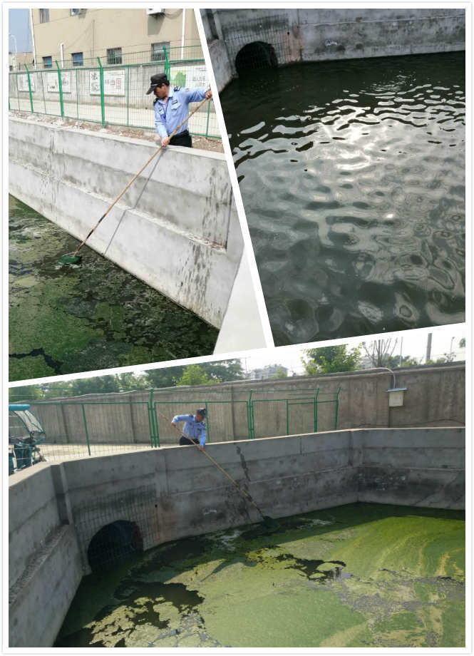 原來的污水溝水源質(zhì)量不行,含有的藻類受到陽光照射,產(chǎn)生光合作用,催生了微生菌,所以水中的綠色漂浮水藻、青苔類較多,等氣溫升高,非常容易引起水質(zhì)發(fā)黑、發(fā)臭。我們安排安保人員用長柄型的濾網(wǎng)斗進行清掏打撈,并及時將打撈上來的垃圾清理運走;同時對安保人員進行安全培訓,在打撈期間注意自身的安全,防止跌落等意外發(fā)生,排除安全隱患。