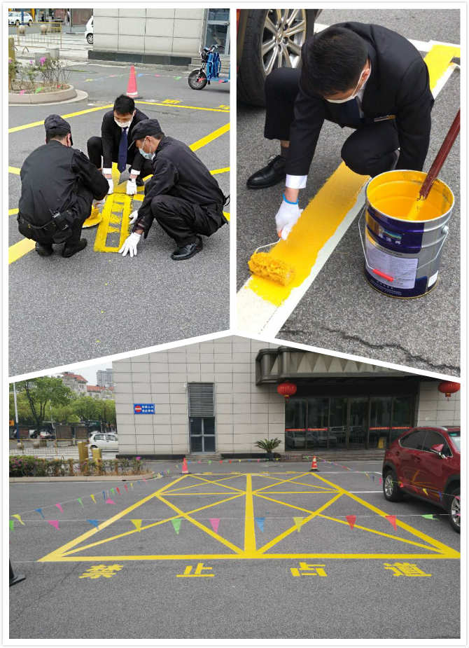 對于在地面畫線這個(gè)事,我們也是第一次操作,大家群策群力,互相配合。別看我們的保安都是男的,干起活來可真是細(xì)致,一絲不茍,先在地上把標(biāo)線貼好,然后再畫,油漆不能沾太多也不能太少,剛開始不熟練,畫的比較慢,后來漸漸找到了竅門,就越畫越快、越畫越好了。畫完又再檢查修補(bǔ)了一遍,讓整體看上去顏色均勻一致。最后又把場地清理干凈,四周圍起來,防止有人或車誤入踩踏,等地面干后就可以投入使用了。甲方對這次工作十分滿意,稱贊我們保安能干。