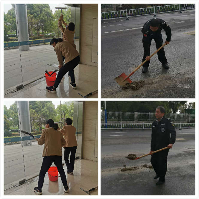 這個月大樓門口由于渣土車來回載運,路面上全都是土塊,我們的保安人員都主動去用鐵鏟鏟除,這些看似不起眼的事情,我們物業(yè)人員都會默默的完成,還有大樓玻璃門需要經(jīng)常搽刮,保潔阿姨們都會互相幫忙,每個樓道的地面衛(wèi)生都拖得跟一面鏡子似的。