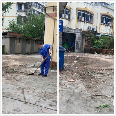 接到通知后,項目部保潔主管立刻到現(xiàn)場了解具體情況,決定下午就對家屬居住區(qū)進(jìn)行整改。從病區(qū)樓層抽調(diào)保潔員對小區(qū)的雜草進(jìn)行清理,機(jī)動師傅將小區(qū)內(nèi)的建筑垃圾清理干凈,再派兩名外場保潔員對綠化帶內(nèi)的垃圾進(jìn)行清理。由于任務(wù)重,時間緊迫,所有員工齊心協(xié)力,任勞任怨,一直到晚上六點多才結(jié)束,每個保潔員也沒有因為延遲下班而感到不滿。