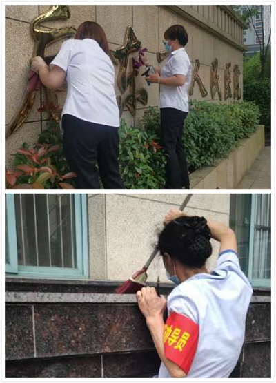 當巡查到大門口的時候,看到"啟東市人民醫(yī)院"的大黃金字上有不少灰塵,由于工友們都在自己的崗位上忙于自己的工作,項目部管理人員就自己拿來毛巾擦了起來。