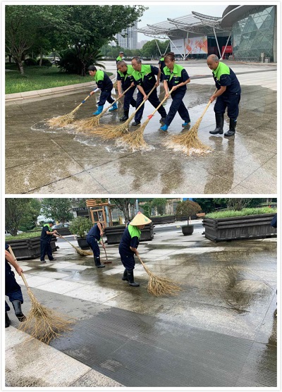 除此之外,由于常州奧體中心室外廣場和停車場的面積體量巨大,室外場地存在大量的積水坑,奧體中心項目部的保潔師傅、阿姨們在完成原本劃分工作任務(wù)之余,大雨一過便開始相互組織起來到室外場地一遍一遍地把積水推掉,并把大雨過后路邊、廣場邊上花壇中涌出來的淤泥一一清理干凈,保證現(xiàn)場不會出現(xiàn)大型積水坑,不影響奧體中心客戶的到訪和市民的每日健身。