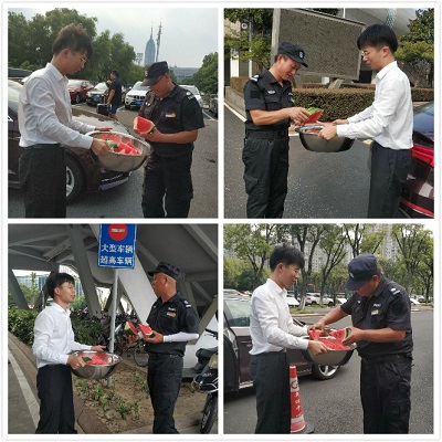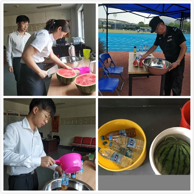 為了員工們的身體健康,奧體中心項(xiàng)目購買了血壓計(jì),每天為上崗人員測(cè)量血壓,并在場(chǎng)館幾個(gè)重要位置放置了龍虎人丹、速效救心丸等急救藥品。在召開班前、班后會(huì)的時(shí)候,項(xiàng)目經(jīng)理、主管都會(huì)詢問、檢查員工身體狀況,囑咐大家這段時(shí)間一定要注意防暑降溫,身體有不適的情況及時(shí)上報(bào),去臨近的空調(diào)室內(nèi)休息。另外,項(xiàng)目還采購了酸梅汁、果汁等飲品,每天早上物業(yè)辦公室管理員就燒開水沖好飲品,放涼后灌入瓶子里,浸在冰水中,每天上午一次、下午一次送到崗位上給員工飲用。買的西瓜也提前放在冰水里浸泡,希望能給員工們帶去絲絲涼意,消暑降溫。