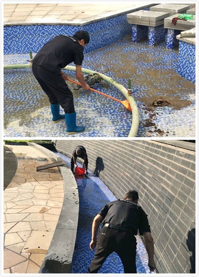 就這樣經(jīng)過(guò)兩個(gè)小時(shí)的細(xì)致擦洗,景觀水池被工作人員清洗地锃光發(fā)亮,看著這么干凈的池子,所有付出的辛勞都是值得的。