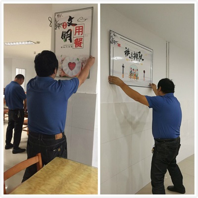 宣傳畫張貼好后,瞬間覺得食堂變得多姿多彩了,不再是單調(diào)的白。項目部做事的高效與時效性給甲方領導留下了深刻的印象,得到了領導的贊賞。