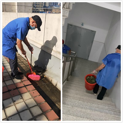 接到這一清理任務(wù),項目部內(nèi)科主管立即安排機(jī)動王師傅,并組織外科樓的機(jī)動黃師傅拿上大紅桶和其他保潔工具到平臺上去清理空調(diào)外機(jī)處的青苔。到了現(xiàn)場后,機(jī)動師傅們先將里面的青苔全部撈出來,再用鏟子把粘在地面上的青苔鏟松。接著黃師傅就跟在后面用掃帚把青苔掃一起,然后再捧進(jìn)紅桶里,滿桶了,兩個師傅就送去垃圾桶里。由于那里是設(shè)備層沒有電梯,所以他們只能爬5層高的樓梯。