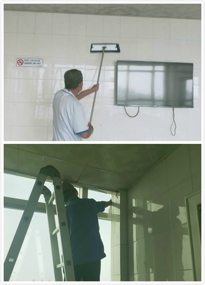接到通知后,外科主管通知機動師傅趕到現(xiàn)場,并告知他們時間緊、任務重,大家齊心協(xié)力一天內必須完成。時間緊迫,所以我們的機動人員也是爭分奪秒,一刻也不休息,外科主管也親自動手,專門負責鏟除墻面上所有的標識標。機動黃師傅負責高處除塵以及所有的窗臺、玻璃擦拭清理。機動王師傅專門負責地面清潔,病區(qū)保潔員負責衛(wèi)生間的打掃清理。大家任務分工明確,中午午休時間也沒有休息,加班加點,終于在大家的努力下,在院方規(guī)定的時間內完成了工作。